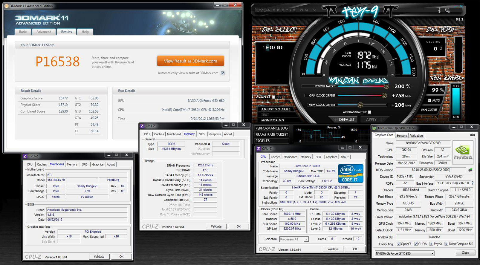 Накануне Винсу удалось улучшить рекорд в бенчмарке 3DMark 11/Performance — 16538 очков. Ключом к успеху стал не только разгон видеокарты EVGA GeForce GTX 680 Classified до частот 1980 МГц для ядра и 7200 МГц для памяти GDDR5, но и разгон шестиядерного процессора Core i7-3930K (LGA2011), которому покорились 5600 МГц под жидким азотом.