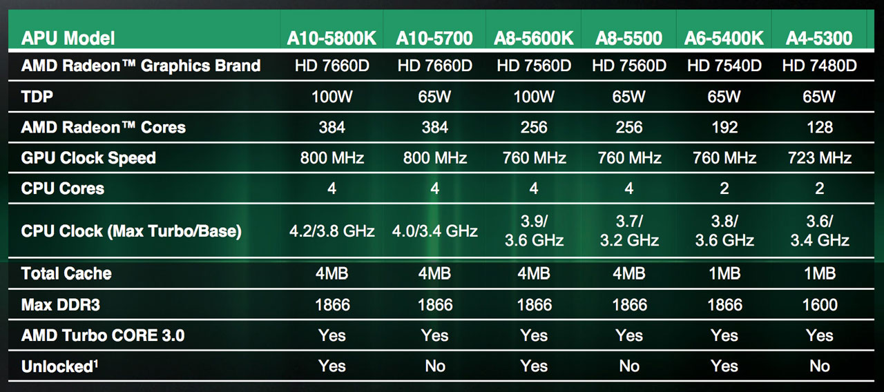 Четырехъядерные (двухмодульные) Trinity оснащены 2x2 МБ кэш-памяти второго уровня, двухъядерные — только 1 МБ кэша L2. Встроенный контроллер ОЗУ поддерживает 128-битный доступ к памяти, т.е. два канала DDR3-1600/1866. Суффикс «K» обозначает разблокированный на повышение множитель. Графическая подсистема в составе 128—384 потоковых процессоров VLIW4 значительно превосходит возможности Intel HD Graphics.