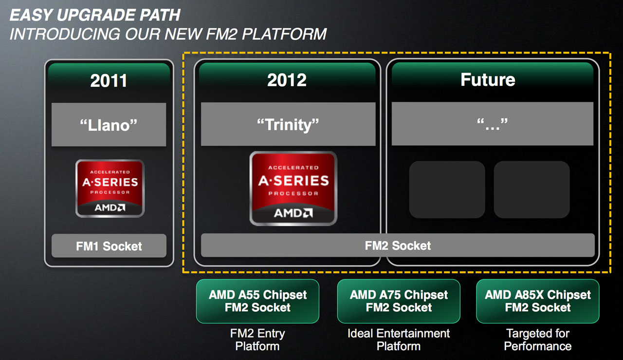 Хорошая новость состоит в том, что следующее поколение APU — Kaveri/Steamroller — будет гарантированно поддерживать платформу Socket FM2. Решения FM1 и FM2 (процессоры, материнские платы) несовместимы друг с другом.