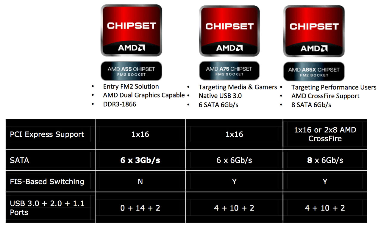 Системные платы FM2 могут использовать как условно старый чипсет A75, так и новый A85X. Последний позволяет организовывать связки CrossFireX по формуле 2x8 и имеет восемь каналов SATA 6 Гбит/с.