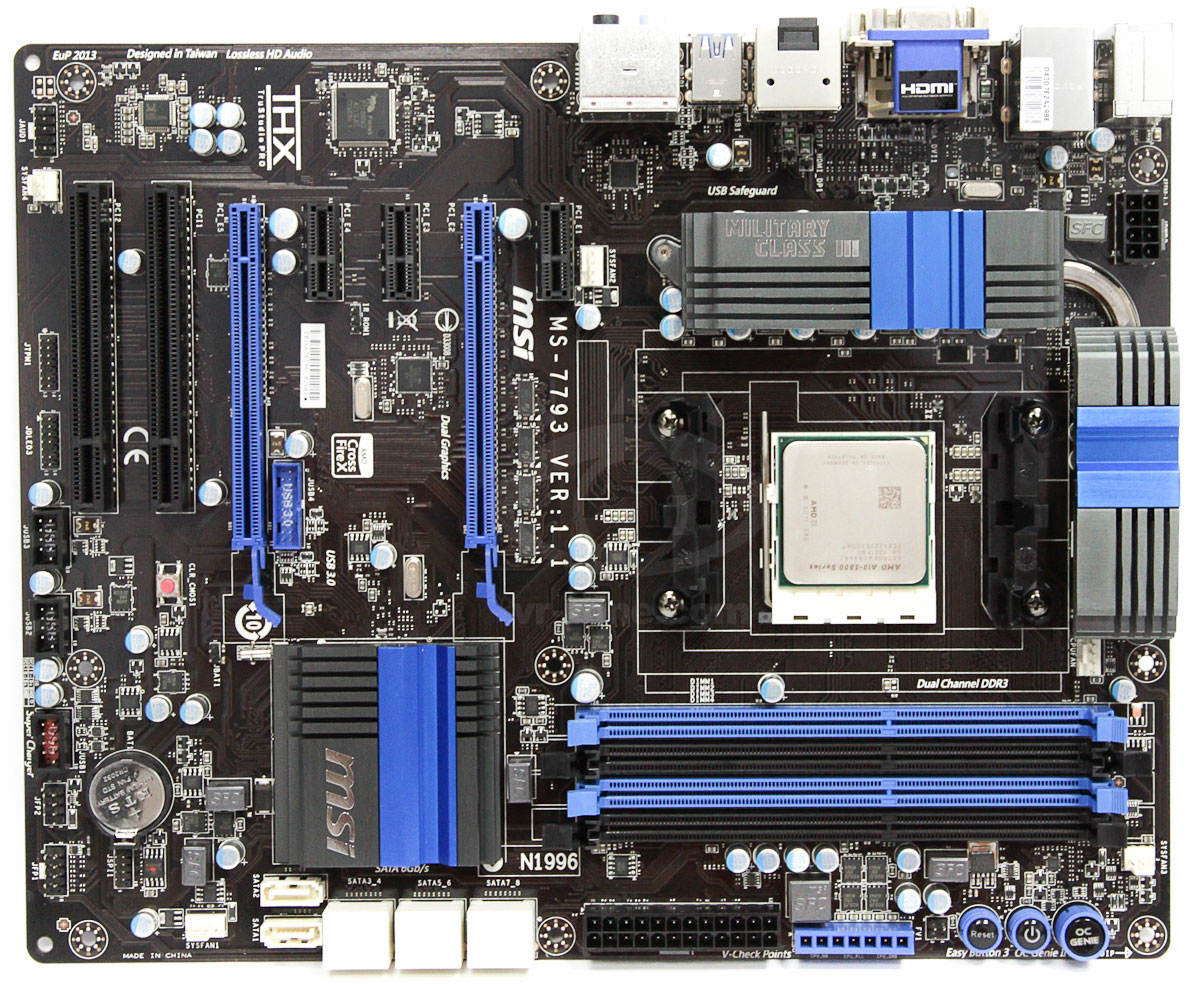 Плата рассчитана на установку четырех модулей оперативной памяти DIMM DDR3, двух видеокарт с интерфейсом PCI Express x16, восьми накопителей SATA 6 Гбит/с, карт расширения PCI-E x1 и PCI. В обязательном порядке присутствуют гигабитный сетевой порт RJ-45 и 7.1-канальный аудиоконтроллер. На задней панели плотной группой разместились комбинированный PS/2, четыре USB 2.0, два USB 3.0, видеовыходы D-Sub, DVI, HDMI и DisplayPort, а также оптический S/PDIF.