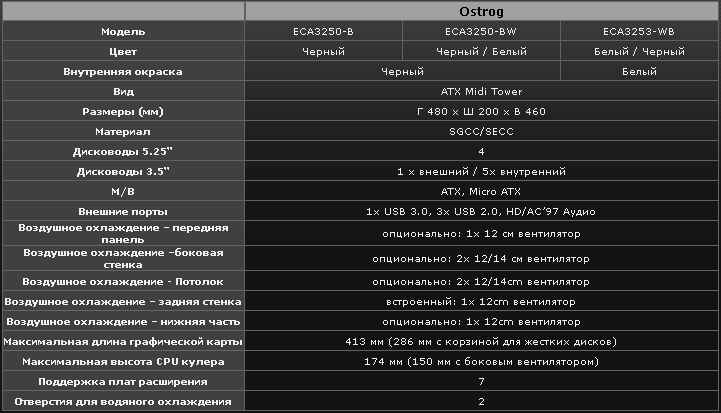 Конструктивно он немного отличается от ECA3250-B/ECA3250-BW: в левой боковой крышке предусмотрено акриловое окно с посадочными местами для вентиляторов. Прочие преимущества — механизмы для крепления накопителей без помощи отвертки, отверстия для укладки кабелей, порт USB 3.0 на панели I/O — также присутствуют и у «братьев» Ostrog White.