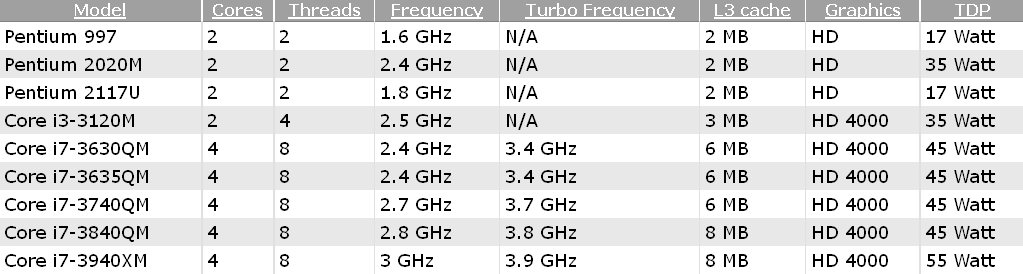 Возглавляет список свежих ЦП четырехъядерный Core i7-3940XM с частотой 3,0/3,9 ГГц (обычный режим/турбо). Примечательно, что он был представлен еще в начале сентября, однако поступил в распоряжение OEM-сборщиков только накануне. Core i7-3940XM поддерживает технологию Hyper-Threading, обладает 8 МБ кэш-памяти третьего уровня, встроенной графикой Intel HD 4000 и тепловым пакетом 55 Вт. Остальные процессоры с четырьмя физическими x86-ядрами работают на 2,4—2,8 ГГц в номинале и на 3,4—3,8 ГГц в режиме динамического разгона. Объем кэша L3 у этих моделей равен 6 МБ (кроме Core i7-3840QM, у которого 8 МБ), уровень TDP — 45 Вт.