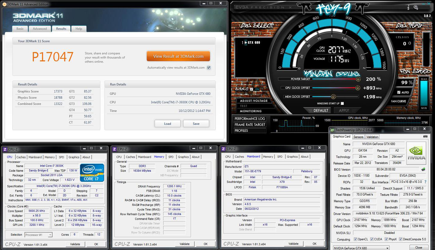 Винс «k|ngp|n» Люсидо продолжает экспериментировать с разгоном видеокарт EVGA GeForce GTX 680 Classified, хотя серийные модели этой премиум-версии GK104 на днях лишились одной из оверклокерских «примочек» — разъема EVBot. Американец установил новый рекорд в тесте 3DMark 11 (режим Performance), разогнав Classified-версию GeForce GTX 680 до 2080 МГц по ядру и 7600 МГц для микросхем памяти GDDR5 соответственно. Новый ориентир для профессиональных охотников за рекордами — 17047 очков.