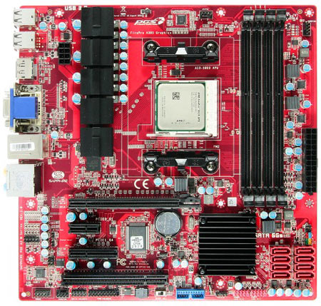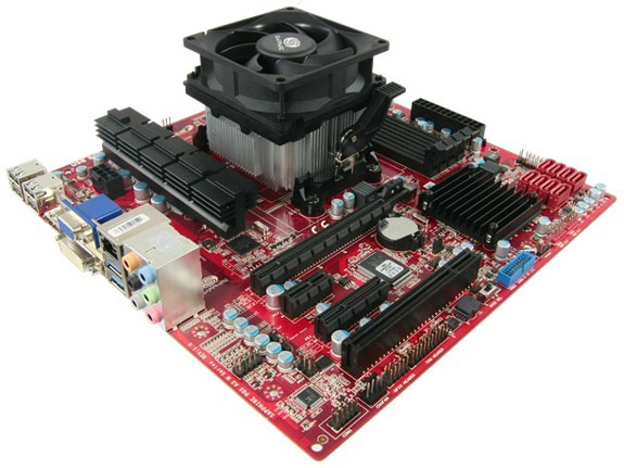 Проектирование и производство системных плат для APU FirePro было поручено давнему партнеру AMD — PC Partner, который хорошо известен рядовым покупателям по розничным брендам Sapphire и Zotac. Эталонное решение оснащено 8-фазной подсистемой питания процессорного разъема FM2, четырьмя слотами для оперативной памяти DDR3-1866 (до 64 ГБ ОЗУ), единичными PCI Express 2.0 x16, PCI-E 2.0 x4, PCI-E 2.0 x1 и PCI. Для подключения накопителей предусмотрены восемь разъемов SATA 6 Гбит/с. На задней панели имеются порты USB 3.0 (2), видеовыходы DVI, DisplayPort и D-Sub.