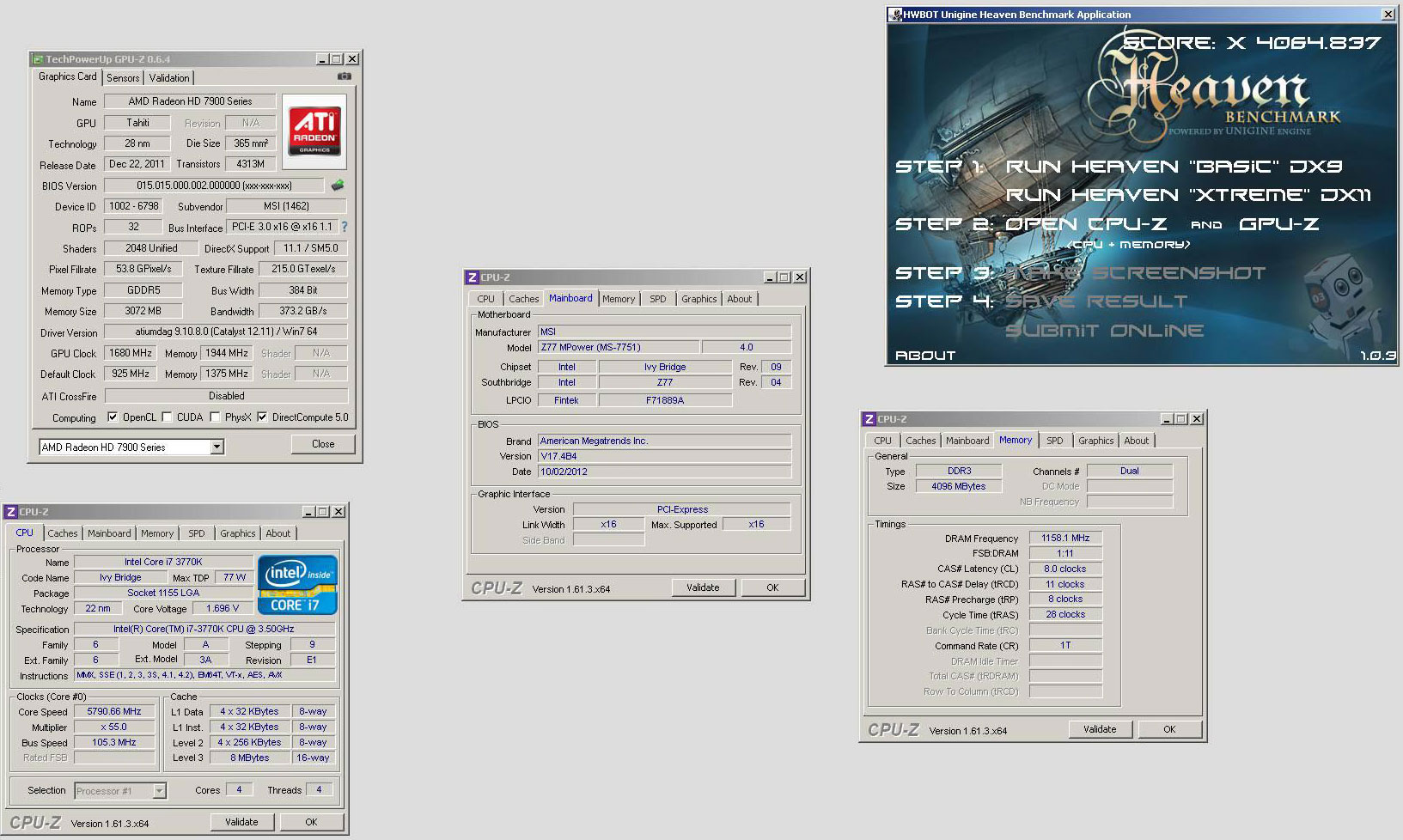 Рекордный результат стал возможен благодаря разгону видеокарты MSI Radeon HD 7970 Lightning до частот 1680/7776 МГц. Относительно скромная частота Core i7-3770K в 5790 МГц объясняется низкой процессорозависимостью теста Heaven DX11, по причине чего он так полюбился экстремальным оверклокерам из Украины. Остальные компоненты системы остались теми же, что и в
