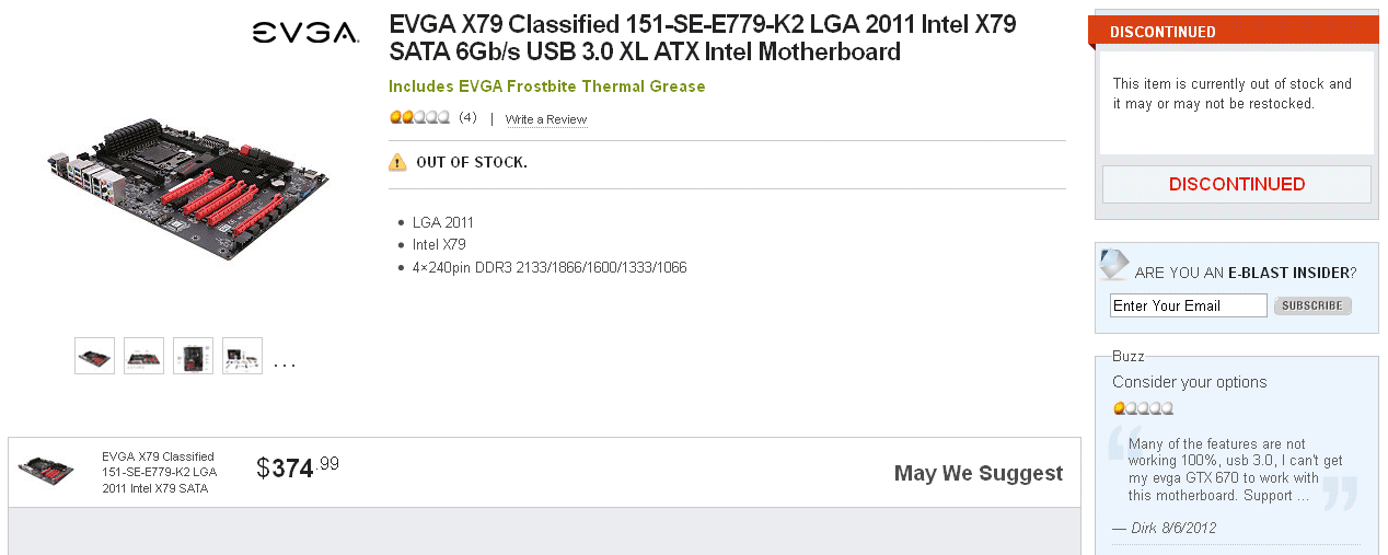 Как выяснилось, вся троица, и особенно X79 Classified, получили массу негативных отзывов, что повлияло на решение Newegg «забанить» старшую плату и провести уценку X79 FTW и X79 SLI. В европейских магазинах EVGA X79 Classified все еще доступна, но, в основном, только по предварительному заказу.