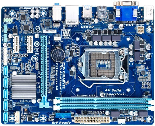 Подсистема питания ЦП включает 5 силовых фаз и разъем дополнительного питания ATX12V. Кроме того, возле слотов DIMM распаян 19-штырьковый коннектор USB 3.0 (2 порта). К сожалению Gigabyte GA-B75M-D2V предлагает только два 4-контактных разъема для подключения вентиляторов (включая процессорный).