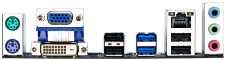На задней панели размещены порты PS/2 для мыши и клавиатуры, видеовыходы DVI-D и D-Sub, четыре USB 2.0, два USB 3.0, единичный RJ-45 (Gigabit Ethernet) и три гнезда Mini-Jack (аудиокодек Realtek ALC887).