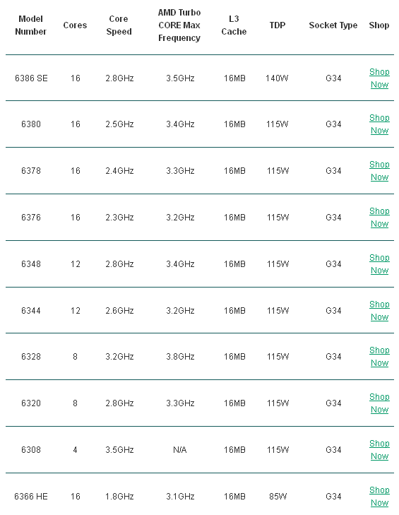 По аналогии с настольными FX/Vishera, представители линейки Opteron 6300 обладают технологией динамического разгона Turbo Core, которая, в зависимости от TDP, допускает кратковременное повышение частоты процессорных ядер на величину до 1,3 ГГц (применительно к экономичному Opteron 6366 HE). Исходя из своих потребностей и выделенного бюджета, заказчики могут выбрать 4-, 8-, 12- или 16-ядерные Opteron для серверных систем.