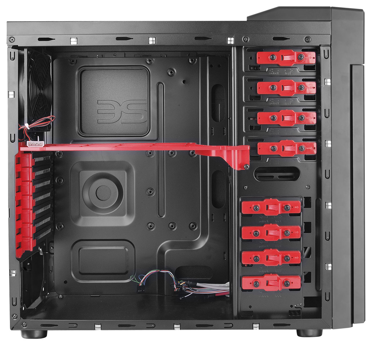 Корпус допускает размещение трех оптических приводов, четырех жестких дисков и 3,5-дюймового картридера или выносной панели с портами USB 3.0. Помимо этого, можно установить материнскую плату ATX, microATX или Mini-ITX, до семи карт расширения PCI/PCI-E и ATX-совместимый блок питания. В комплект поставки входит один 120-мм вентилятор (1200 об/мин).