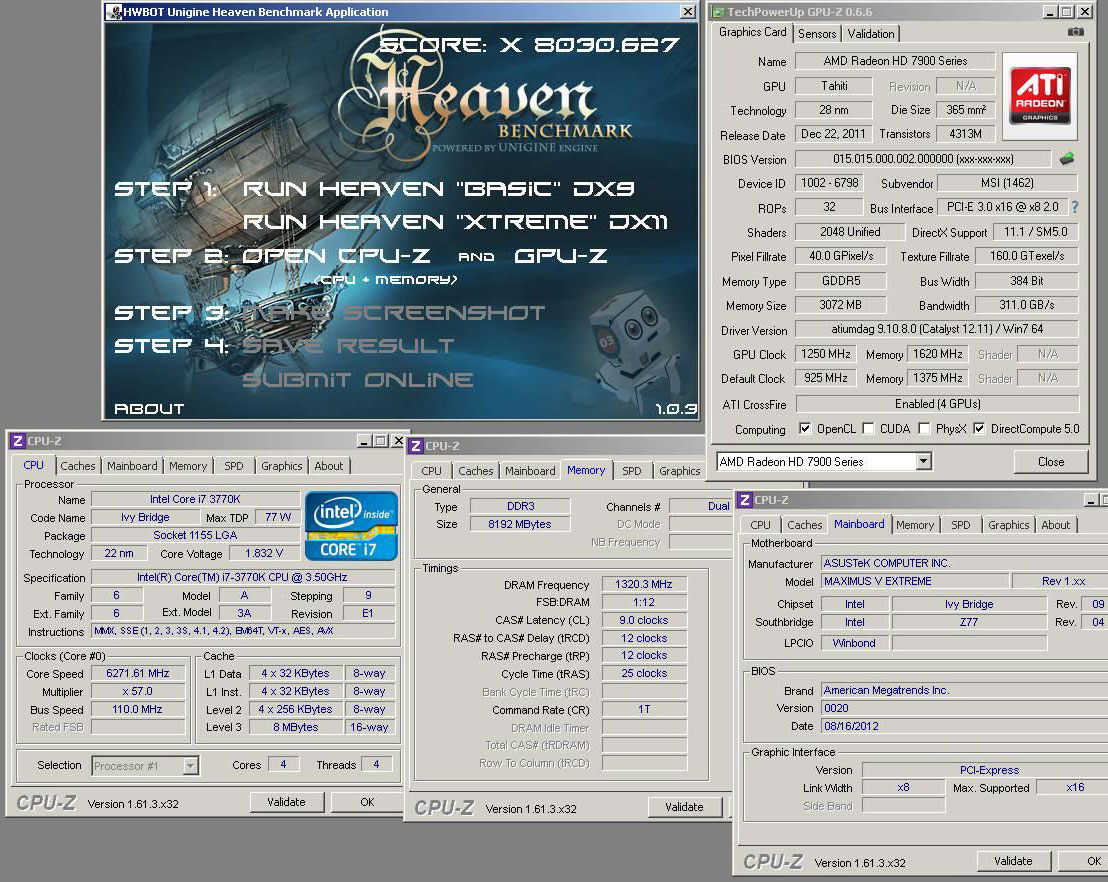 Разгон графических ускорителей в среднем составил 1250 МГц по ядру и 6500 МГц для микросхем памяти GDDR5. Для тех, кто считает подобные показатели слишком скромными, отметим, что для 4-Way CrossFireX важна стабильность системы в целом. Максиму удалось опередить в Unigine Heaven лидеров оверклокерского цеха — rsannino, Mad222, Rbuass, AndreYang, Hicookie и Gyrock. Полный перечень результатов: