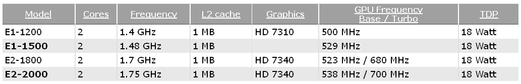 Компанию данному APU составит другой процессор семейства Brazos 2.0 — AMD E1-1500. Чип также располагает двумя x86-ядрами Bobcat и 2x 512 КБ кэш-памяти второго уровня, но при этом работает на сниженной частоте 1,48 ГГц. Ближайшим «родственником» E1-1500 является модель E1-1200 с номиналом 1,4 ГГц, интегрированным графическим ядром Radeon HD 7310 (500 МГц) и 18-ваттным тепловым пакетом. Предварительно известно, что 80 шейдерных блоков готовящегося процессора E1-1500 функционируют на частоте 529 МГц.