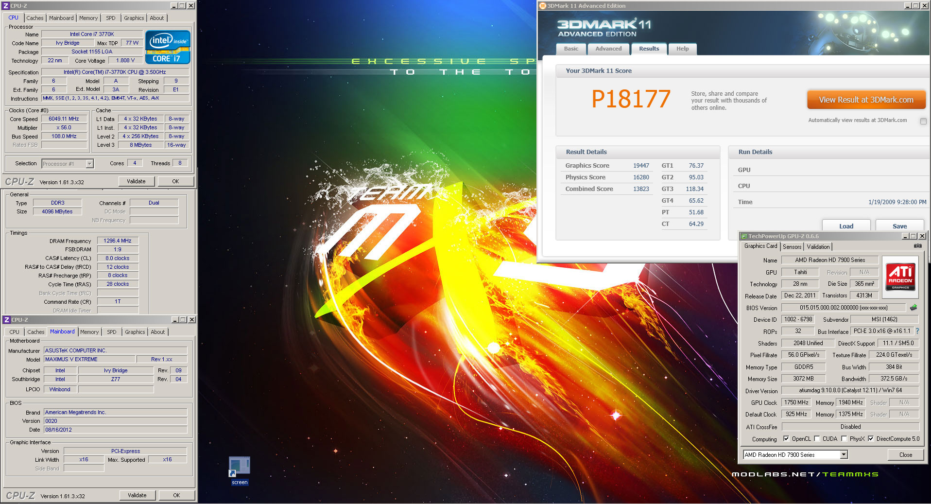3DMark 11 для систем с одним графическим процессором. При помощи разогнанной до 1750/7760 МГц видеокарты MSI Radeon HD 7970 Lightning и процессора Intel Core i7-3770K (с частотой 6049 МГц) Максим набрал