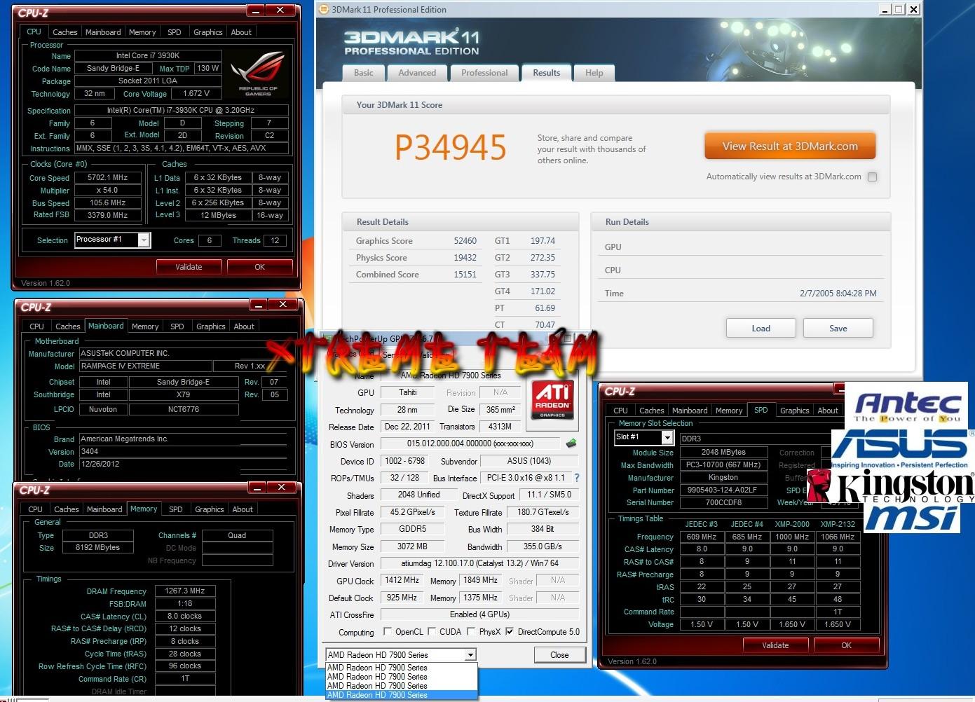 34945. Для рекорда победителю недавнего Asus Open Overclocking Cup 2012 понадобились четыре видеокарты MSI R7970 Lightning, процессор Core i7-3930K @5,7 ГГц, материнская плата Asus Rampage IV Extreme (X79) и комплект оперативной памяти Kingston HyperX DDR3 @2535 МГц.
