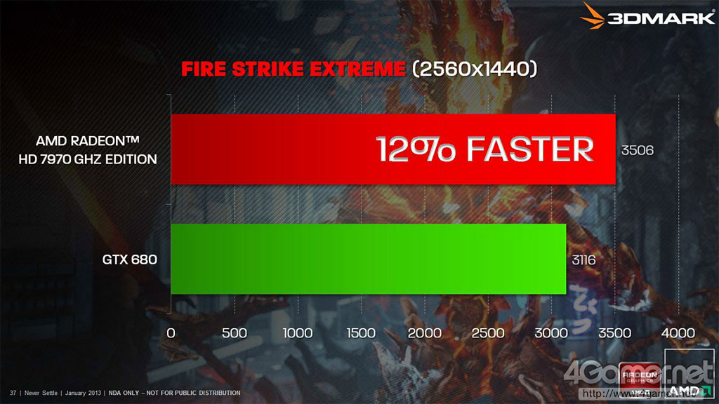 Слайды, предоставленные топ-менеджером AMD, иллюстрируют преимущество старших Radeon HD 7000 над представителями семейства Kepler в новом бенчмарке 3DMark, особенно в подтесте 3DMark Extreme: