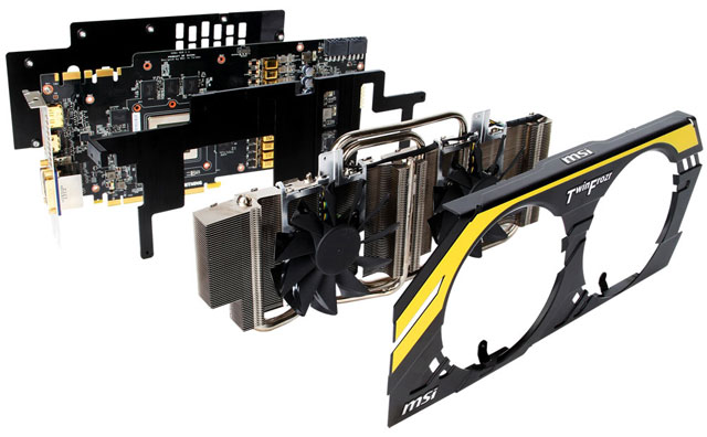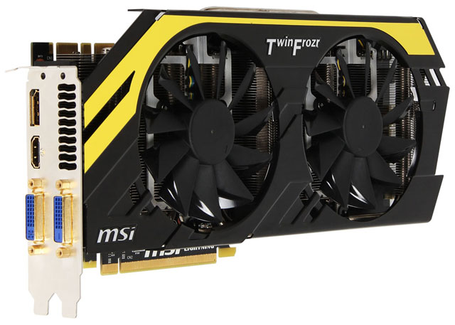 Кулер Twin Frozr IV состоит из медного никелированного основания, пяти медных тепловых трубок (2x 8-мм, 3x 6-мм), плотного массива алюминиевых пластин и пары 100-мм вентиляторов. Карта, как и ее «старшая сестра», оперирует 1536 потоковыми процессорами, 128 TMU, 32 ROP, шиной памяти разрядностью 256 бит и 2 ГБ буферной памяти GDDR5.
