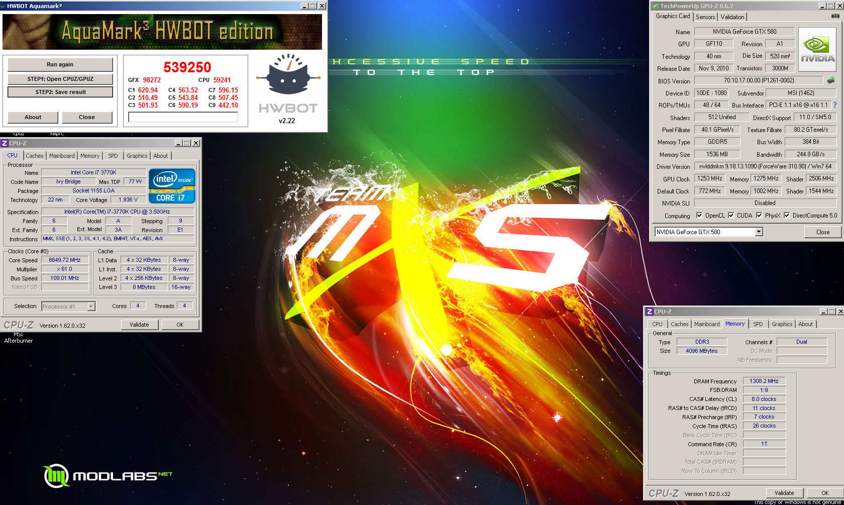 В системе, помимо MSI N580GTX Lightning (@1253/5100 МГц), были задействованы: процессор Core i7-3770K @6650 МГц, материнская плата Asus Maximus V Extreme, двухканальный комплект оперативной памяти G.Skill Trident DDR3 @2616 МГц, блок питания Corsair 1200W, испарители для жидкого азота KingpinCooling Venom 6.66 и Tek-9 FAT 6.0.