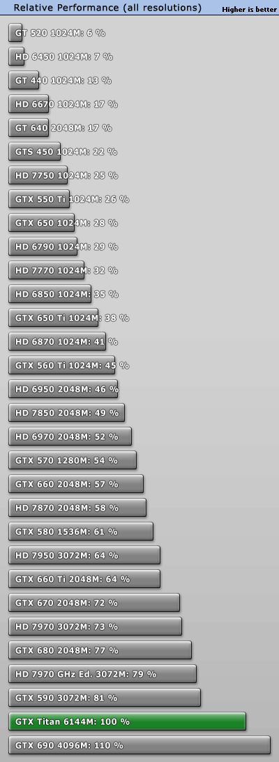 Сводная диаграмма производительности GeForce GTX Titan в сравнении с другими актуальными ускорителями по результатам тестирования в 18 играх и бенчмарке 3DMark 11 во всех разрешениях выглядит следующим образом: