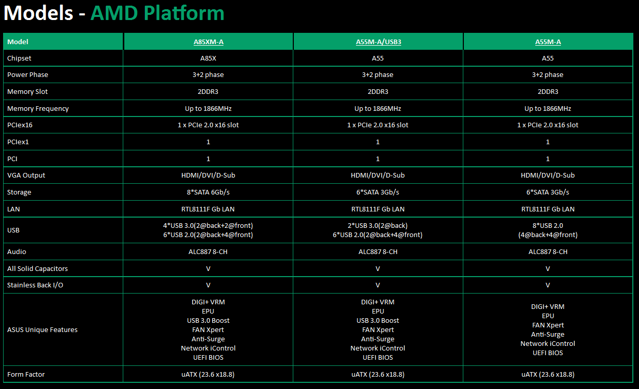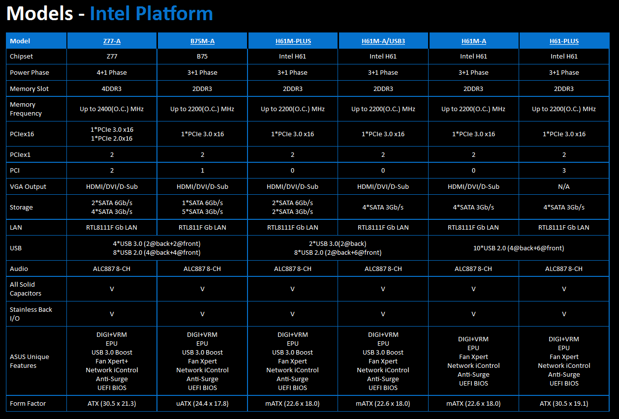 Все подробности о новинках изложены в специальном разделе сайта asus.com, мы же ограничимся только фотографиями данных материнских плат и их сравнительными характеристиками: