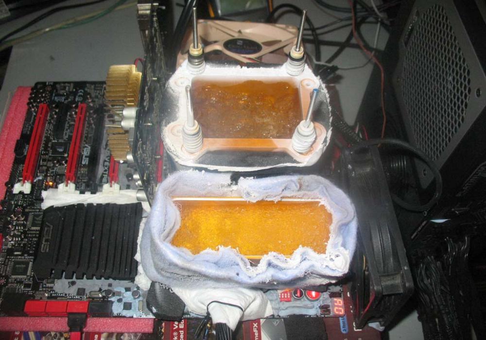 Естественно, не обошлось без жидкого азота, которым охлаждались четырехъядерный процессор Core i7-3770K (@6930 МГц) и два модуля памяти G.Skill Pi DDR3 @2500 МГц (тайминги 7-9-6-24-1T). Кроме них система включала испарители для LN2 Venom 6.66 и Ney Pro производства KingpinCooling, материнскую плату Asus Maximus V Extreme (Z77) и блок питания Corsair AX-1200.