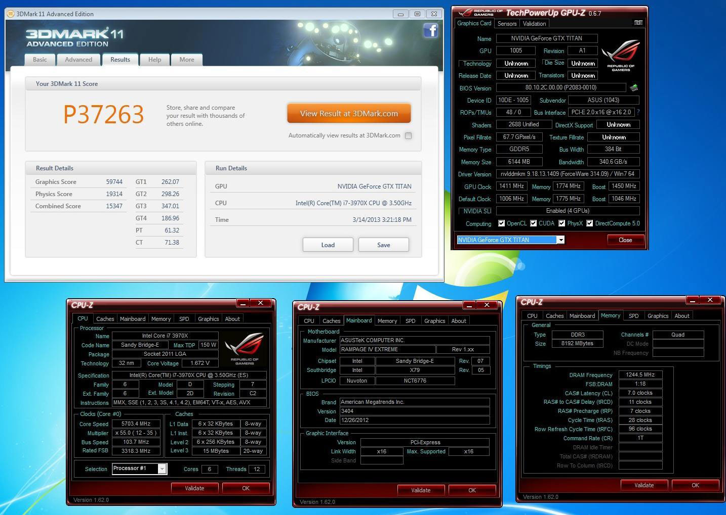 AndreYang и Shamino запаслись внушительным объемом жидкого азота и разогнали видеоадаптеры GTX Titan до 1450/7100 МГц (ядро/память). Процессор Core i7-3970X функционировал на частоте 5703 МГц, память — в режиме DDR3-2489 (тайминги 7-11-7-28-1T). Эксперименты проводились с использованием материнской платы Asus Rampage IV Extreme на чипсете Intel X79, блоков питания Antec и Thermaltake.