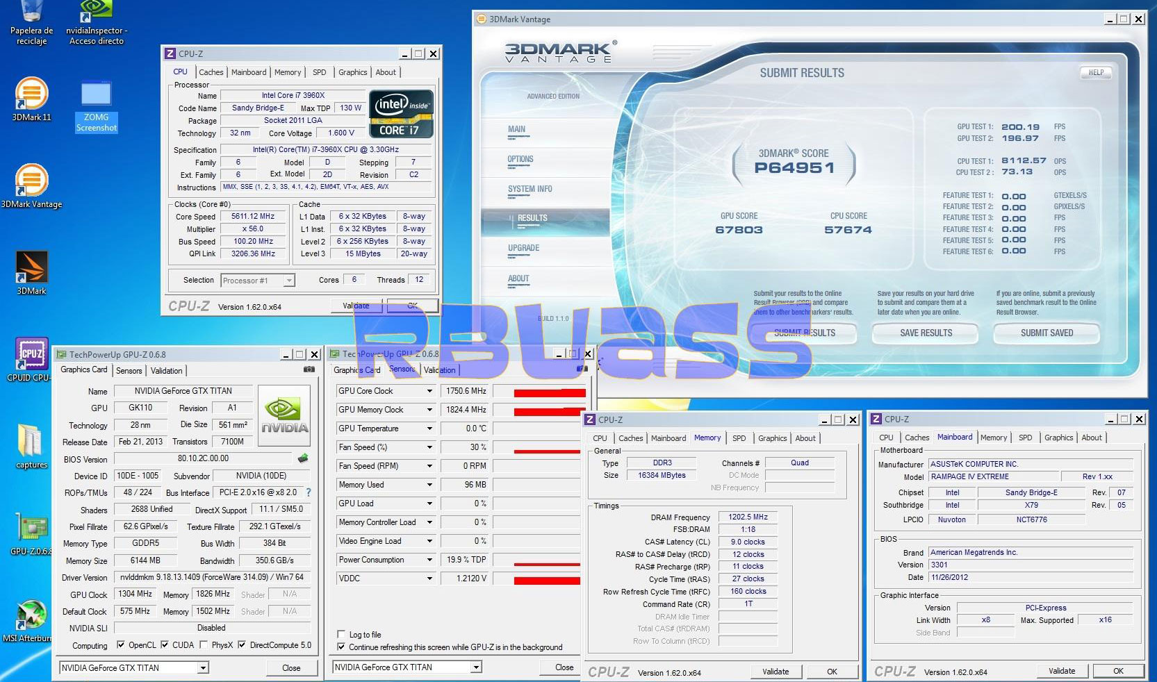 В состав конфигурации тестового стенда вошли: материнская плата Asus Rampage IV Extreme, процессор Intel Core i7-3960X @5611 МГц, четырехканальный комплект оперативной памяти DDR3 @2405 МГц и «зомби-версия» видеокарты GeForce GTX Titan эталонного дизайна. Отрицательная температура CPU и GPU поддерживалась с помощью жидкого азота.