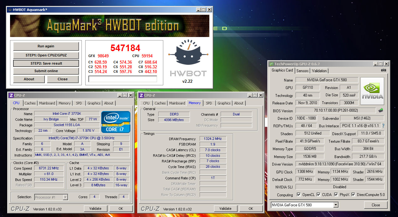 Конфигурация стенда была следующей: материнская плата Asus Maximus V Extreme на чипсете Intel Z77, разогнанный до 6731 МГц процессор Core i7-3770K, две планки оперативной памяти G.Skill Pi DDR3 на частоте 2648 МГц с таймингами 7-10-7-28 и Command Rate 1T, видеокарта MSI N580GTX Lightning (@1308/4536 МГц), блоки питания Corsair и Seasonic мощностью 1200 и 1000 Вт соответственно, испарители для жидкого азота Venom 6.66, Tek-9 FAT 6.0 и Ney Pro марки KingpinCooling.