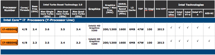 Core i7-4950HQ и Core i7-4850HQ дебютируют на рынке в третьем квартале, предположительно, в октябре. Более скромный чип имеет те же характеристики, что и старшая модель, за исключением рабочих частот — 2,3 ГГц в номинале и 3,3—3,5 ГГц с активированной функцией Turbo Boost.