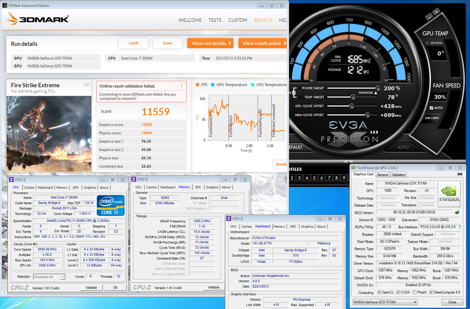 Для экспериментов k|ngp|n задействовал материнскую плату EVGA X79 Dark на чипсете Intel X79, шестиядерные CPU Intel Core i7-3930K и Core i7-3960X, 16 ГБ оперативной памяти DDR3 с эффективной частотой свыше 2400 МГц, а также немалый объем жидкого азота. Для управления частотами применялась утилита EVGA Precision версии 4.0.