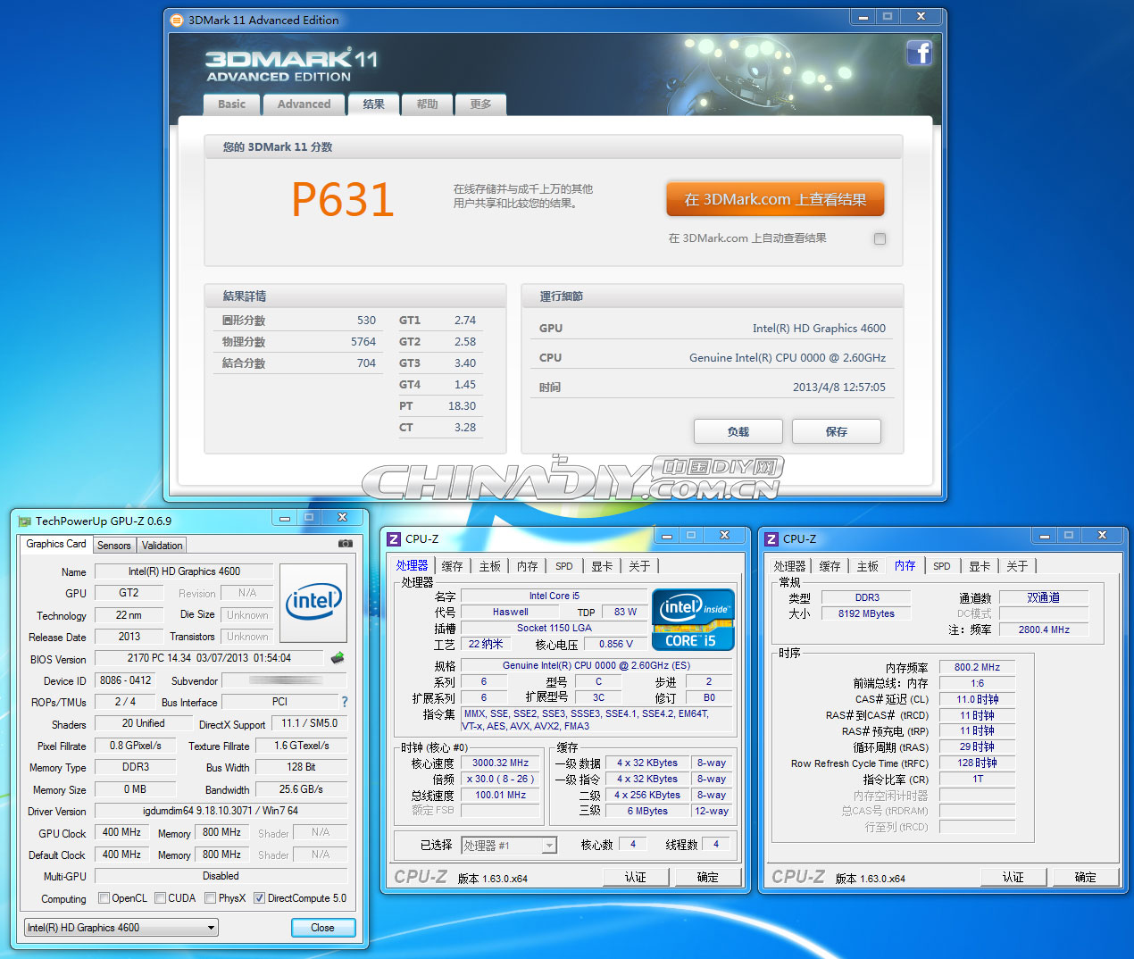 - 3DMark 11/Performance: P631 (GPU — 530, CPU — 5764);