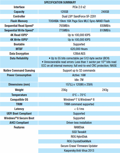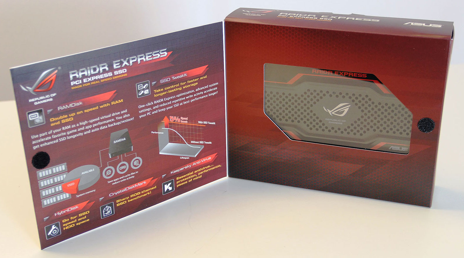 В комплект поставки входит программное обеспечение RAMDisk, SSD TweakIt, ROG HybriDisk, ROG CrystalDiskMark и Антивирус Касперского (2013). Энергопотребление Asus RAIDR не превышает 16 Вт в рабочем режиме и 7 Вт в режиме простоя.