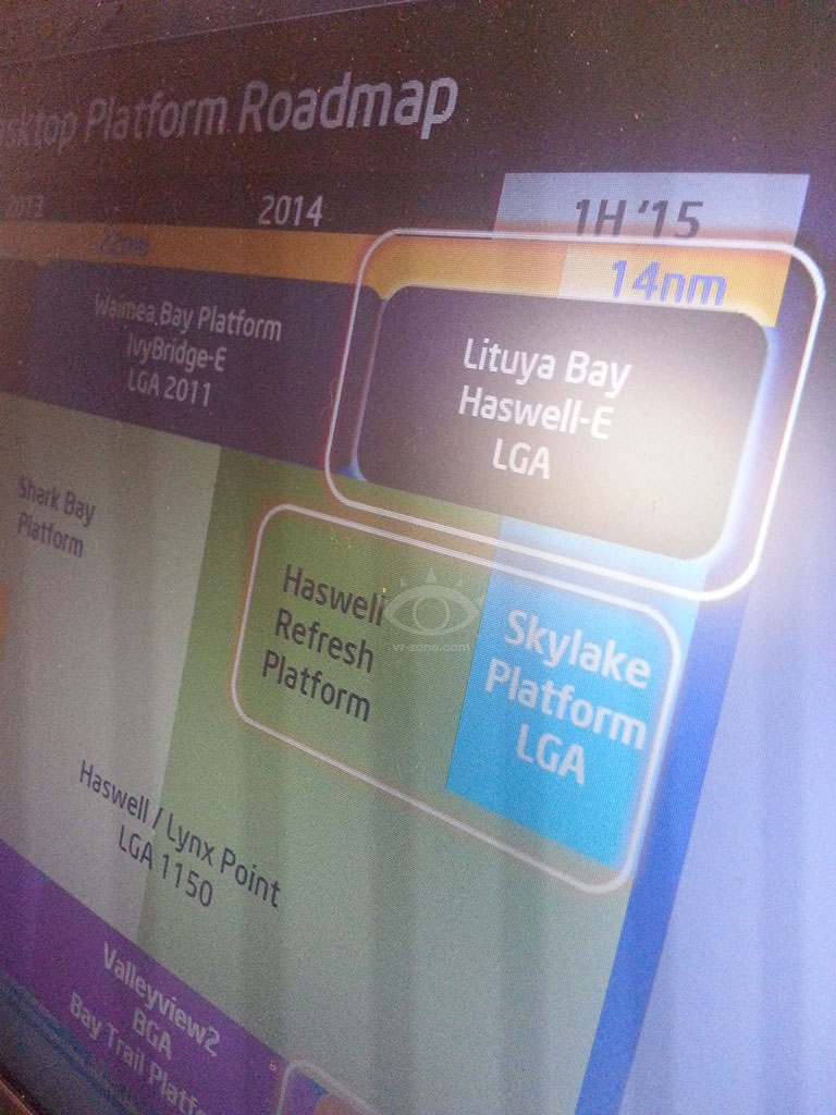 Мэйнстрим-процессоры Haswell и платформа Shark Bay будут актуальны примерно до середины следующего года. Под обозначением «Haswell refresh» (в пер. с англ. обновление Haswell), скорее всего, подразумевается процессорная линейка Broadwell. Удивительно, но CPU Broadwell будут использовать старый к тому времени 22-нанометровый техпроцесс, а значит прогнозы аналитиков насчет замедления перехода на новые технологические нормы отнюдь не беспочвенны. В первой половине 2015 года дебютируют процессоры Skylake (14-нм) в LGA-исполнении и cо встроенным контроллером DDR4.