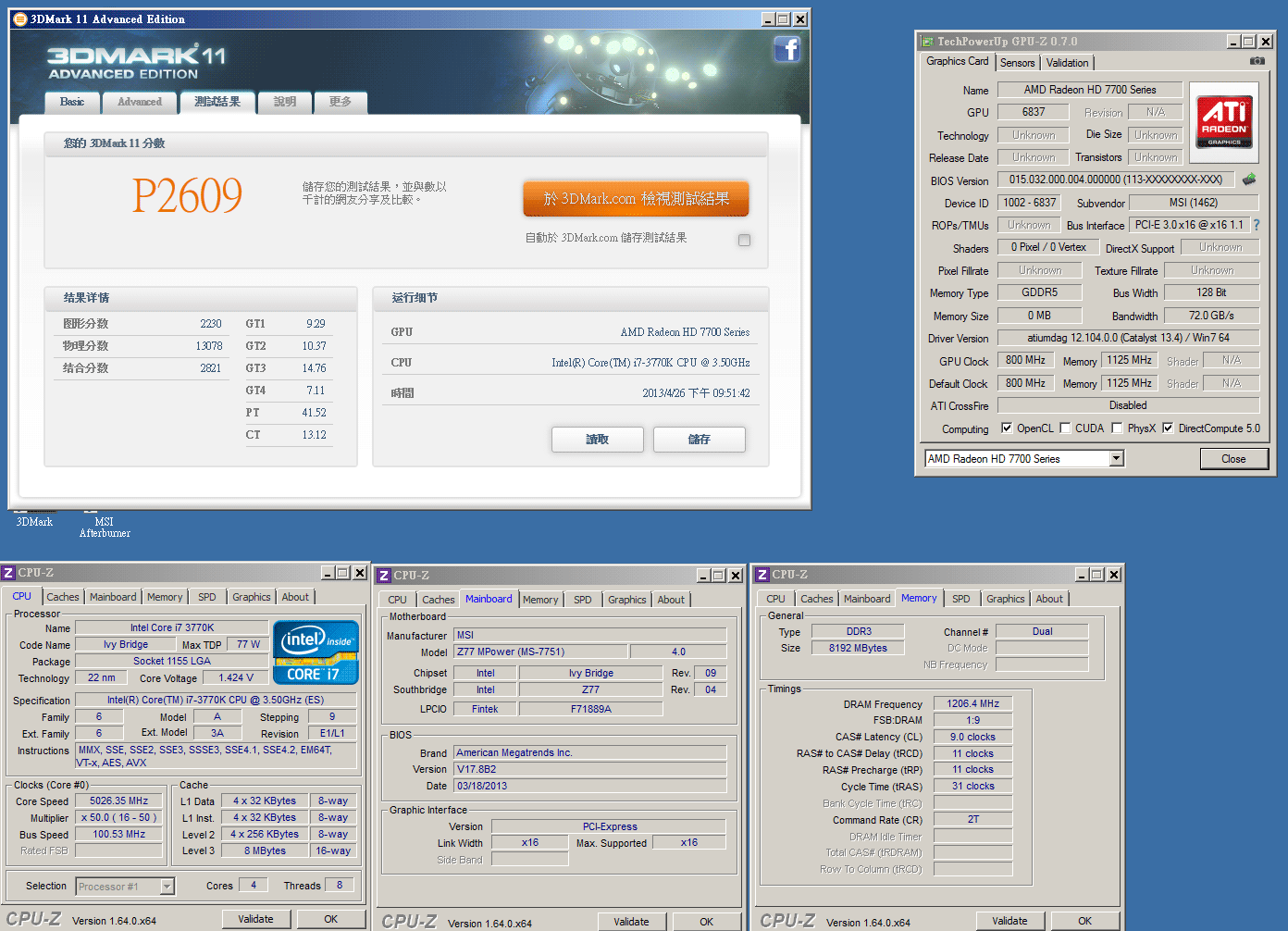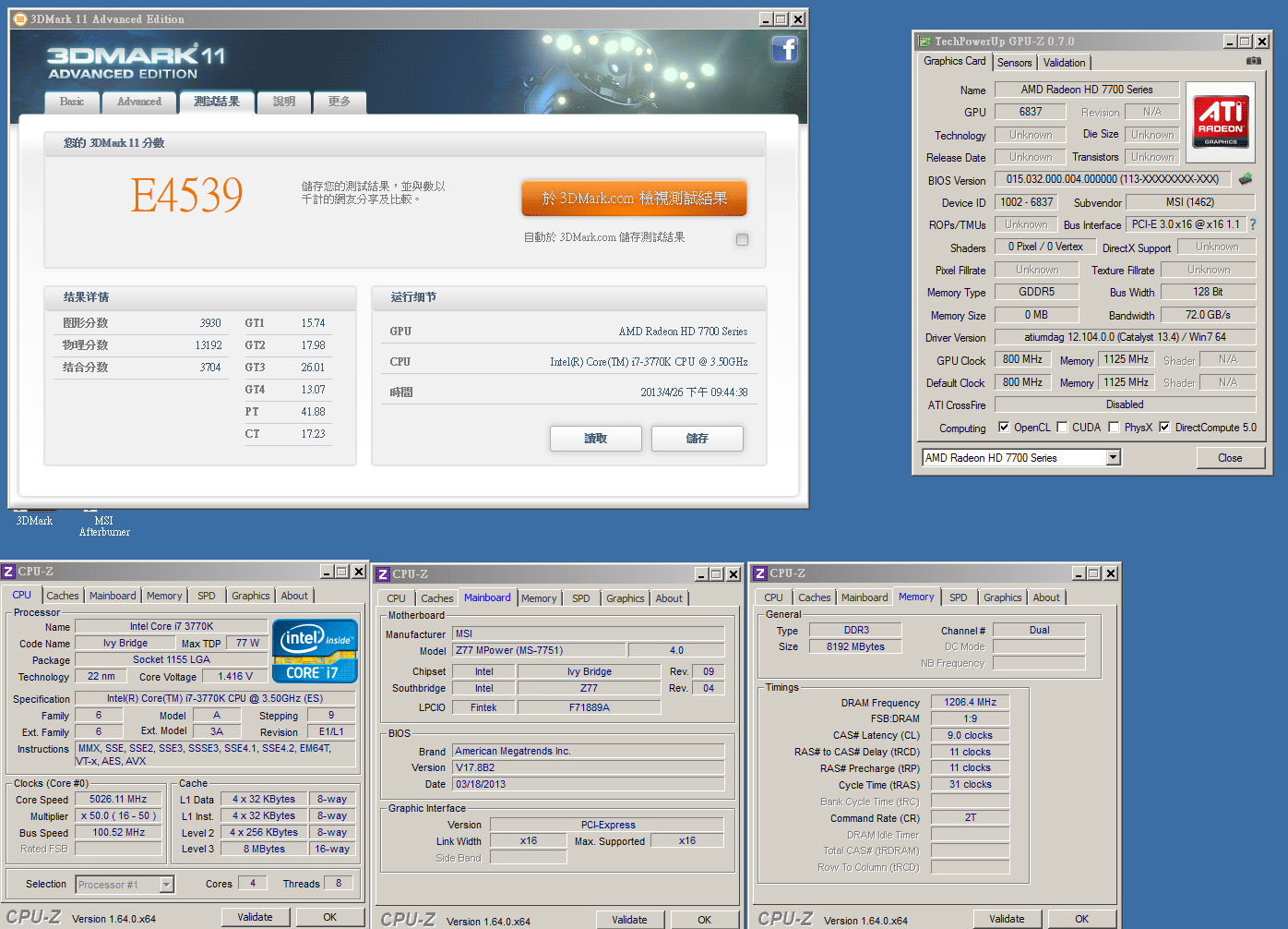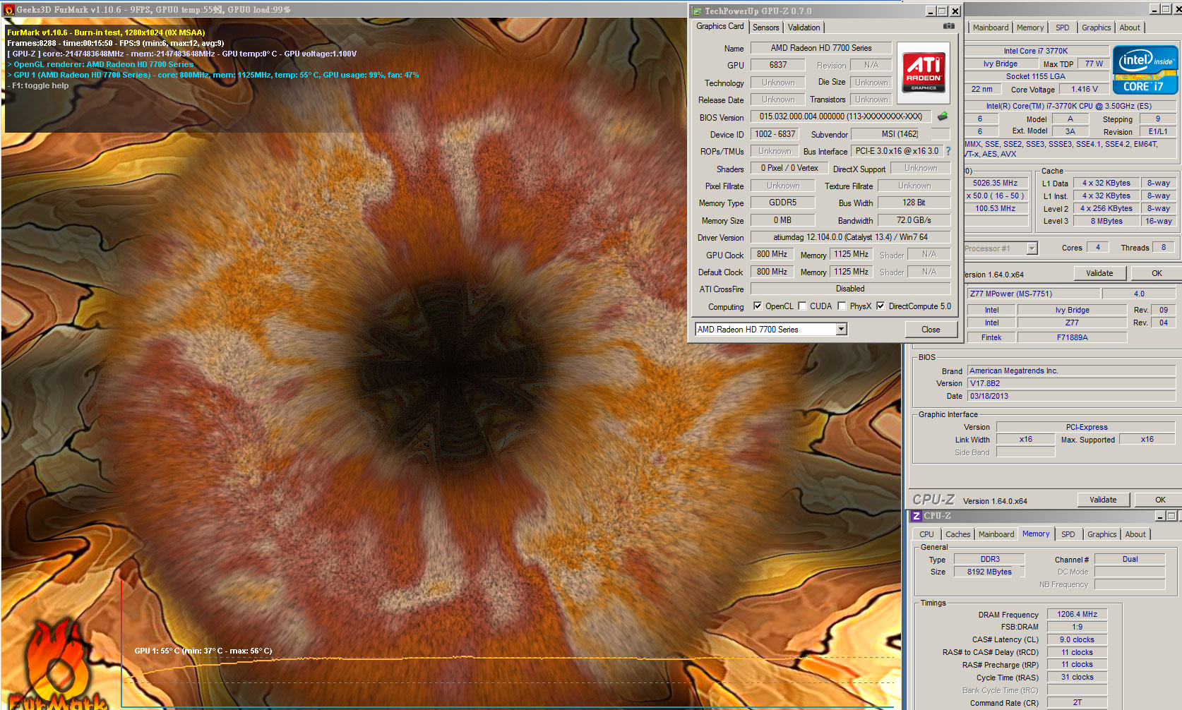 Под нагрузкой видеочип прогревается максимум до 56 °C. Частоты Radeon HD 7730 равны 800/4500 МГц для ядра и памяти GDDR5 соответственно. Объем буферной ОЗУ составляет 1 ГБ (указано на коробке).