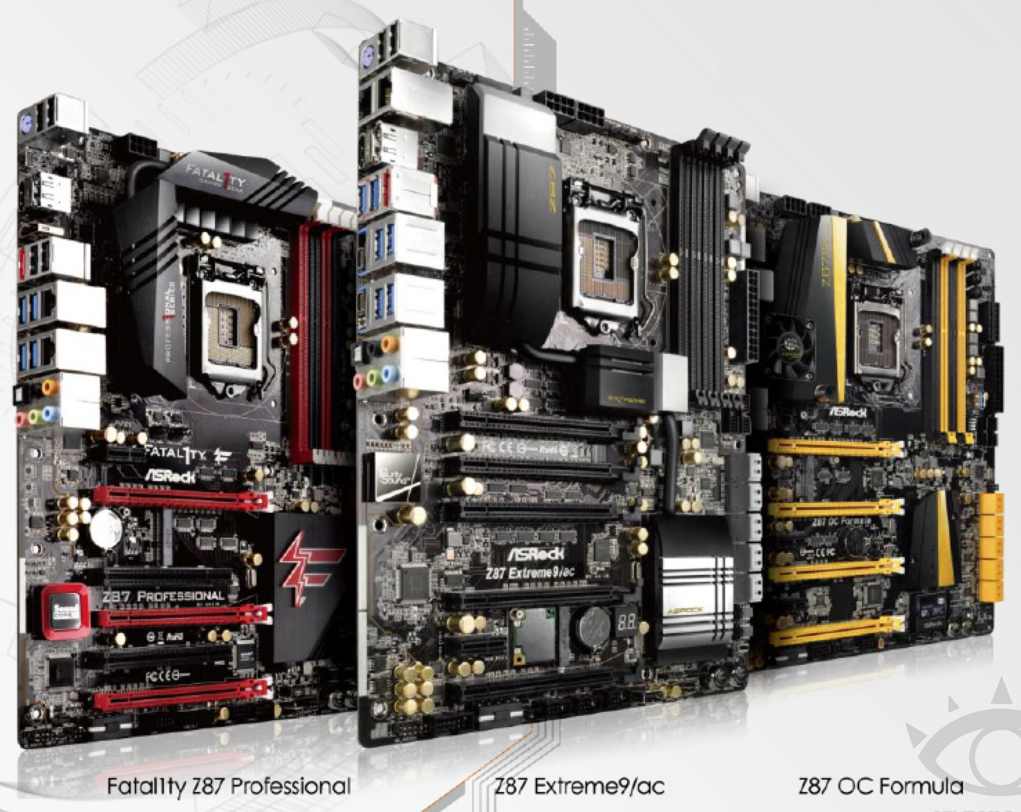 На следующем фото в центре изображена ASRock Z87 Extreme9/ac — модель с исключительно богатым функционалом: 5x PCI-E 3.0 x16, 10x SATA, Wi-Fi (802.11ac), 6x USB 3.0, 2x Thunderbolt. Для экспериментов с разгоном предусмотрены два силовых разъема EPS12V.