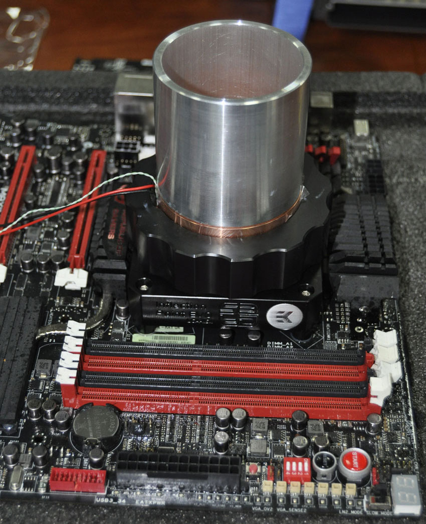 Процессорный «стакан» для LN2 под названием Inflection Point Evo внешне напоминает гильзу от дробовика. Его нижняя часть изготовлена из меди, верхняя — из алюминия (для снижения себестоимости и уменьшения веса). Изделие поддерживает мейнстрим-платформы Intel LGA1150, LGA1155 и LGA1156.