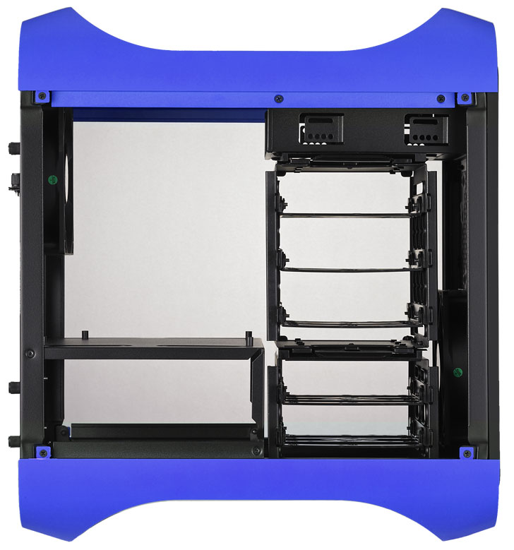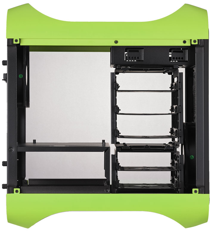 Шасси новых Prodigy привычно окрашено в черный цвет. Доступны посадочные места для материнской платы Mini-ITX, двух карт расширения PCI/PCI-E, одного оптического привода, трех-пяти (в зависимости от наличия видеоадаптера) 3,5-дюймовых жестких дисков и максимум девяти 2,5-дюймовых SSD.