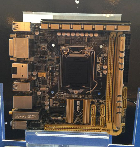 «Малютка» Z87I-Deluxe, по-видимому состоит из двух печатных плат аналогично решению P8Z77-I Deluxe. На одной из них распаяны элементы питания CPU, на другой — интерфейсные разъемы и гнездо LGA1150. Отметим наличие слота PCI-E 3.0 x16, шести SATA 6 Гбит/с и двух DIMM.