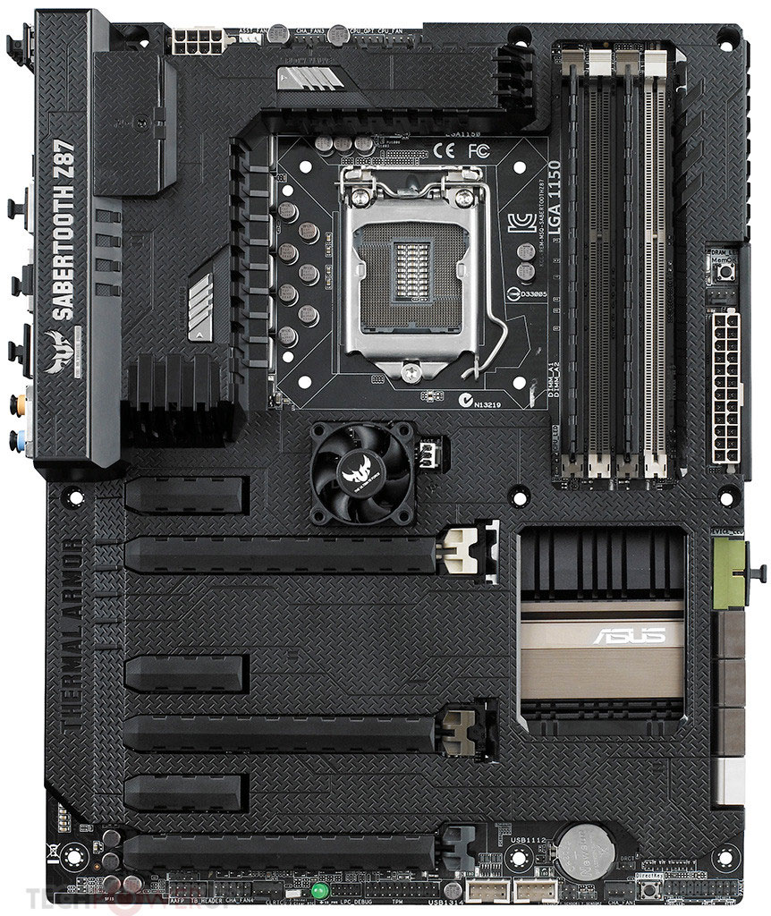 Выполненная в форм-факторе ATX, плата ASUS Sabertooth Z87 располагает четырьмя слотами для оперативной памяти DDR3 с поддержкой до 32 ГБ ОЗУ, двумя разъемами PCI Express 3.0 x16 для установки видеокарт, единичным PCI-E 2.0 x16@x4 и трио PCI-E x1. Для подключения накопителей используются порты SATA 6 Гбит/с (8 ед.) и eSATA 6 Гбит/с (2 ед.). Также доступны шесть USB 3.0 (4 на задней панели), гигабитный сетевой контроллер, 7.1-канальный аудиокодек, видеовыходы HDMI и DisplayPort.