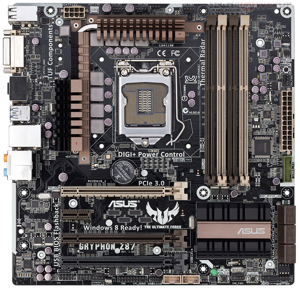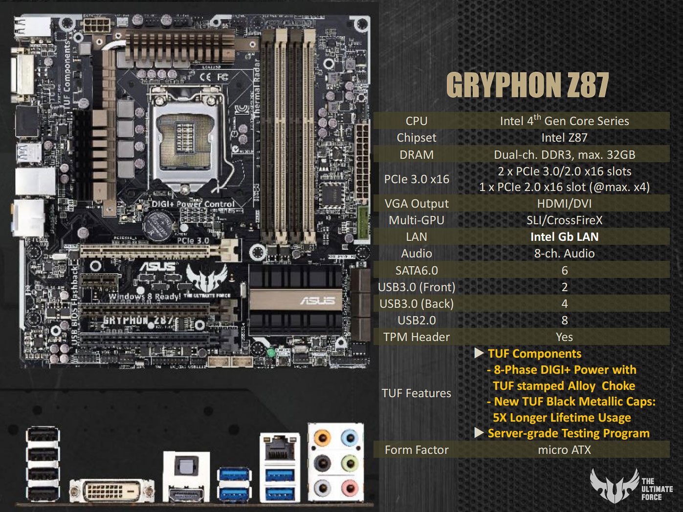 ASUS Gryphon Z87 — первое решение серии TUF формата microATX. Продукт обладает многими характерными для Sabertooth особенностями, в частности отборными электрическими компонентами и строгой методикой предпродажного тестирования. Кожух Armor Kit можно будет приобрести отдельно от платы.