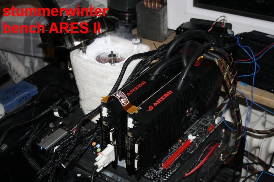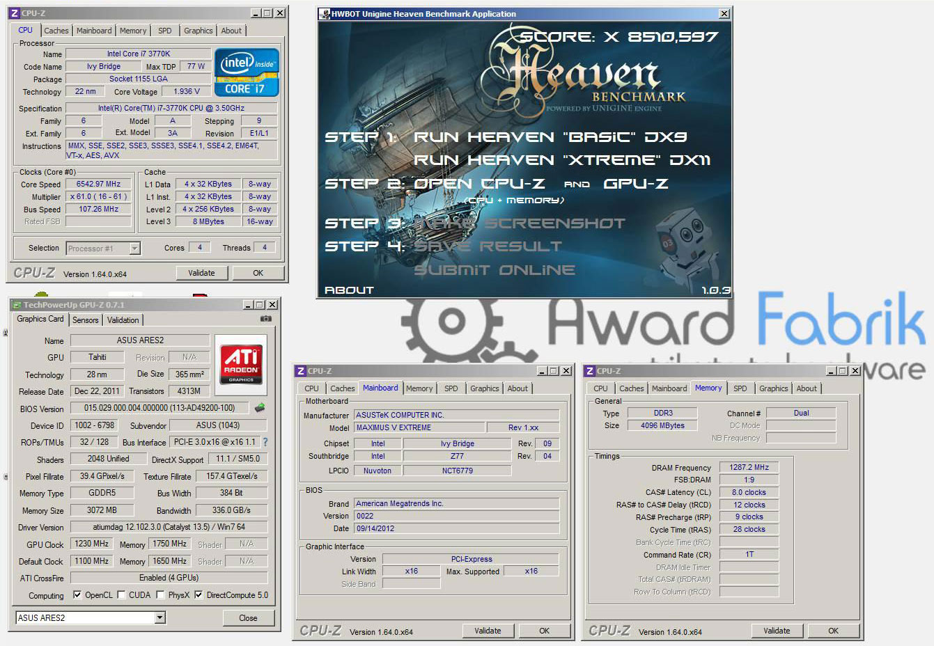 Немецкий мастер разгона Борис «stummerwinter» Кюнцлер побил рекорд, а затем и резервный результат (бэкап) австралийских оверклокеров в бенчмарке Unigine Heaven на предустановке Extreme. Для этого ему понадобились: разогнанный до 6543 МГц процессор Core i7-3770K, два 2 ГБ модуля памяти DDR3 с эффективной частотой 2574 МГц и таймингами 8-12-9-28-1T, а также две видеокарты Asus ROG Ares II, носящие неофициальное название «Radeon HD 7970 X2» благодаря выдающимся на момент релиза характеристикам.