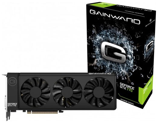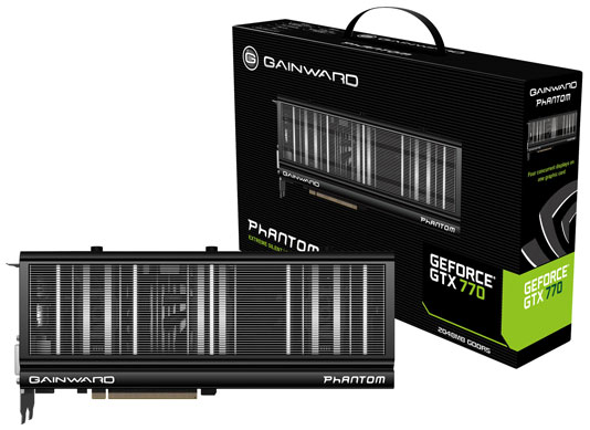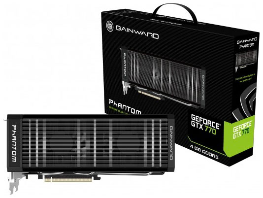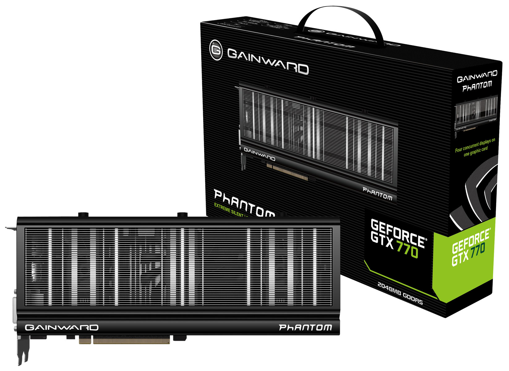 GeForce GTX 770. Дочерний бренд компании Palit Microsystems снабдил новинки на чипе GK104-425-A2 нестандартными системами охлаждения. «Продвинутый» кулер Phantom включает пять 8-мм медных тепловых трубок, что позволило инженерам значительно повысить частоту GPU. Ниже приведены маркетинговые наименования карт Gainward GTX 770 и их рабочие частоты. Один из ускорителей Phantom оснащен 4 ГБ памяти GDDR5.