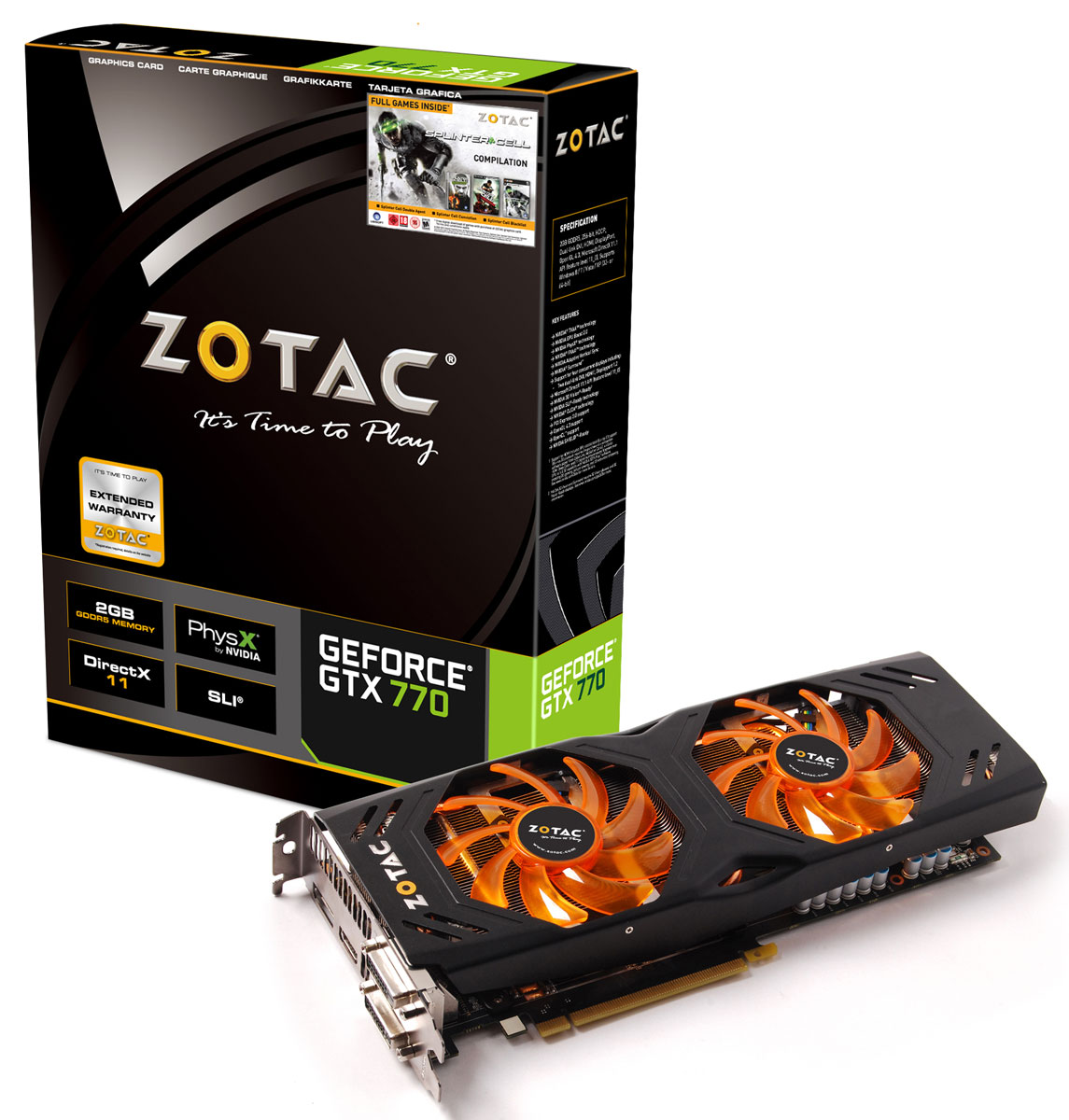 Не сговариваясь с конкурентом, Zotac представила похожий модельный ряд GeForce GTX 770: 2-гигабайтный и 4-гигабайтный адаптеры с частотами, близкими к рекомендованным, а также 2-гигабайтный вариант с заводским разгоном.