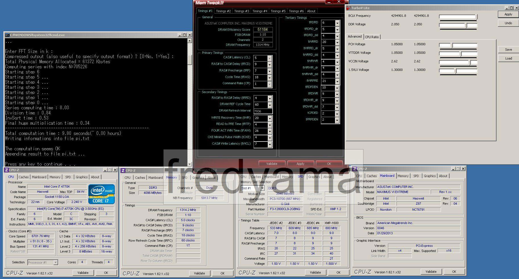 Официальный дебют процессоров Core i5/i7-4000 ознаменовал собой новый сезон падения мировых рекордов на HWBot. Так, с помощью Core i7-4770K был установлен лучший результат в бенчмарке PiFast: японец fredyama зафиксировал прохождение теста за 9,8 сек. при частоте процессора 6,7 ГГц. Напряжения и опорная частота регулировались на лету.