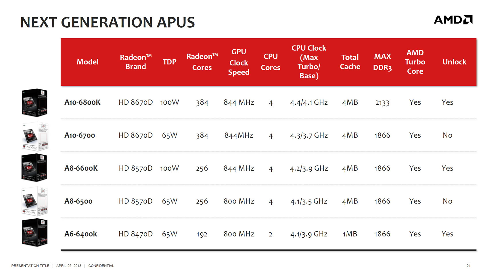 На момент официального анонса 5 июня семейство APU Richland включает шесть моделей: четырехъядерные A10-6800K (оптовая цена $142), A10-6700 ($142), A8-6600K ($112), A8-6500 ($112) и двухъядерные A6-6400K (~$75) и A4-4000 (~$42). Основные характеристики старших APU приведены в таблице ниже.