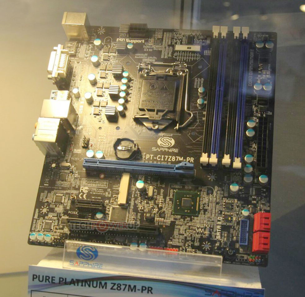 Компания Sapphire привезла на Computex 2013 прототипы материнских плат LGA1150 на базе набора системной логики Intel Z87 Express. Оба решения, судя по схемотехническому дизайну, относятся к категории бюджетных либо среднебюджетных продуктов. Модель Pure Platinum Z87A-MA выполнена в форм-факторе ATX. Она имеет 4-канальную подсистему питания CPU, четыре слота для оперативной памяти DDR3-2400+, по одному разъему PCI Express 3.0 x16 и PCI-E 2.0 x4, по паре PCI-E 2.0 x1 и PCI.