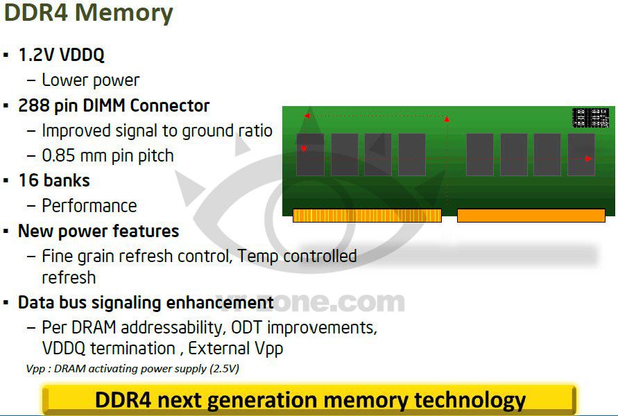 Процессоры Intel Haswell-E поддерживают память UDIMM и RDIMM DDR4 без типично серверной функции контроля ошибок (ECC). Модули DDR4 стандартно должны работать при напряжении 1,2 В, но, очевидно, что в первое время производители ОЗУ для оверклокеров будут подавать на планки DDR4 более высокое напряжение — примерно 1,35 В.