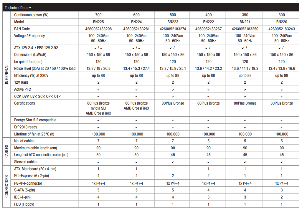 Блоки Pure Power L8 номиналом 600 и 700 Вт оборудованы кабелями с четырьмя разъемами PCI-E Power (6+2)-pin для питания видеокарт. Подробная конфигурация кабелей и ключевые характеристики новых БП марки be quiet! приведены ниже. Рекомендованные цены производитель сообщит в ближайшее время. Срок гарантии составляет 3 года.