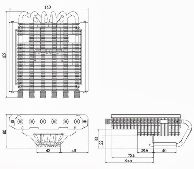 Кулер состоит из покрытого никелем медного основания, шести медных тепловых трубок диаметром 6 мм и 48 алюминиевых пластин с межреберным расстоянием 2 мм. Как и AXP-100, дебютант наверняка будет совместим со всеми платформами Intel и AMD последних лет.
