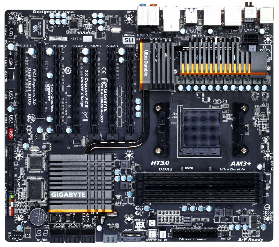 Обновленная плата Gigabyte GA-990FXA-UD7 на базе набора системной логики AMD 990FX/SB950 может работать со 125- и 140-ваттными процессорами, четырьмя модулями DDR3-1066/.../2000 общим объемом до 32 ГБ, графическими связками 4-Way CrossFireX и 4-Way SLI. Доступны шесть портов SATA с пропускной способностью 6 Гбит/с, четыре канала USB 3.0 (2 порта на задней панели), разъем PCI, гигабитный сетевой интерфейс и 7.1-канальный аудиокодек Realtek ALC889.